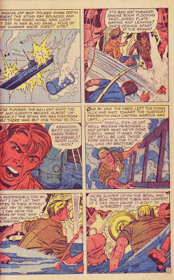The tale of a submarine crew facing the Japanese has a few Kirby tics, including the use of quotation marks, so this may have been scripted by Kirby and edited by Lee, who revised some of Kirby's more distinctive features. I'm uncertain of the inker, although it may be a combination of Sol Brodsky and George Klein. Whoever inked it, the sharp lines are clean and effective.