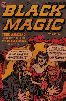 Cover to Black Magic # 27 by Jack Kirby; letters by Ben Oda. Very likely inspired by the atmospheric 1942 movie "The Cat People" directed by Jacque Tourneur. The cat on the right is actually Yancy Streeter Barry Pearl's cat "Kirby", who enjoys wearing scarves and tee-shirts.